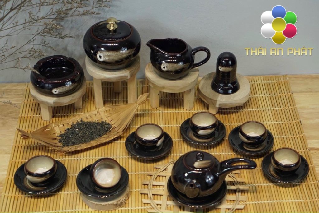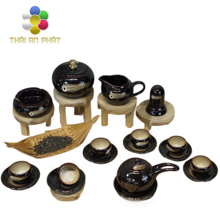 • Bao gồm:1 ấm, 6 chén (ly), 7 đĩa kê, bình đựng trà khô, gạt tàn, lọ đựng tăm, ống đựng nước tráng.